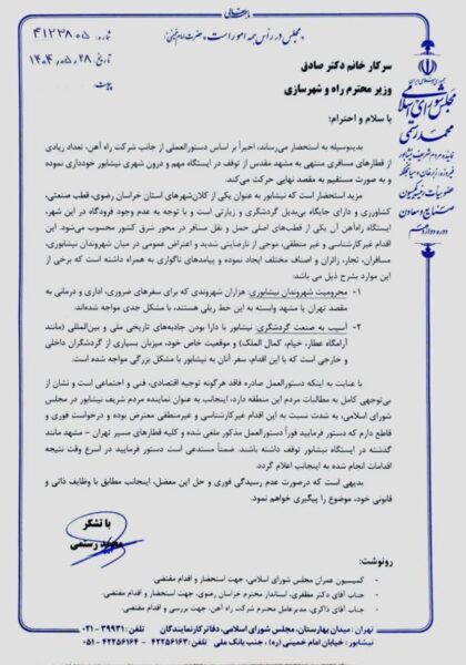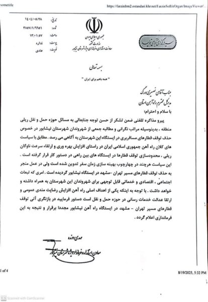 مهدی دونده معاون استاندار و فرماندار ویژه نیشابور نیز طی نامهای مراتب نگرانی و مطالبه شهروندان نیشابور را در این خصوص به اطلاع مدیرکل راهآهن استان اعلام کرد.