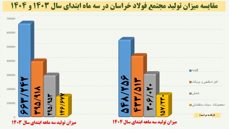 در مقابل، تولید گندله در این بازه زمانی با کاهش مواجه شده است. آمارها نشان می‌دهد که فولاد خراسان در سه‌ماهه نخست ۱۴۰۴ حدود ۵۴۸ هزار و ۲۵۶ تن گندله تولید کرده که نسبت به ۶۶۳ هزار و ۲۴۲ تن سال گذشته، کاهش ۱۷.۳ درصدی را نشان می‌دهد.