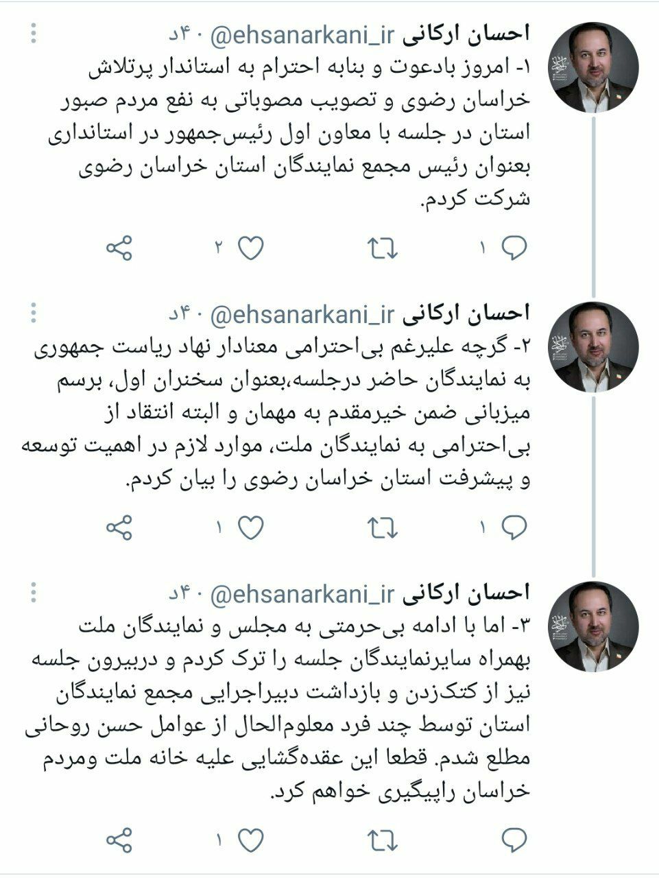 “امروز با دعوت و بنا به احترام به استاندار پرتلاش خراسان رضوی و تصویب مصوباتی به نفع مردم صبور استان در جلسه با معاون اول رئیس جمهور در استانداری به عنوان رئیس مجمع نمایندگان استان خراسان رضوی شرکت کردم گرچه علیرغم بی احترامی معنادار نهاد ریاست جمهوری به نمایندگان حاضر در جلسه به عنوان سخنران اول به رسم میزبانی ضمن خیر مقدم به مهمانان و البته انتقاد از بی‌احترامی به نمایندگان ملت موارد لازم در اهمیت توسعه و پیشرفت استان خراسان رضوی را بیان کردم اما با ادامه بی‌حرمتی به مجلس و نمایندگان ملت به همراه سایر نمایندگان جلسه را ترک کردم و در بیرون جلسه نیز از کتک زدن و بازداشت دبیر اجرایی مجمع نمایندگان استان توسط چند فرد معلوم الحال از عوامل حسن روحانی مطلع شدم قطعاً این عقده گشایی علیه خانه ملت و مردم خراسان را پیگیری خواهم کرد.”
