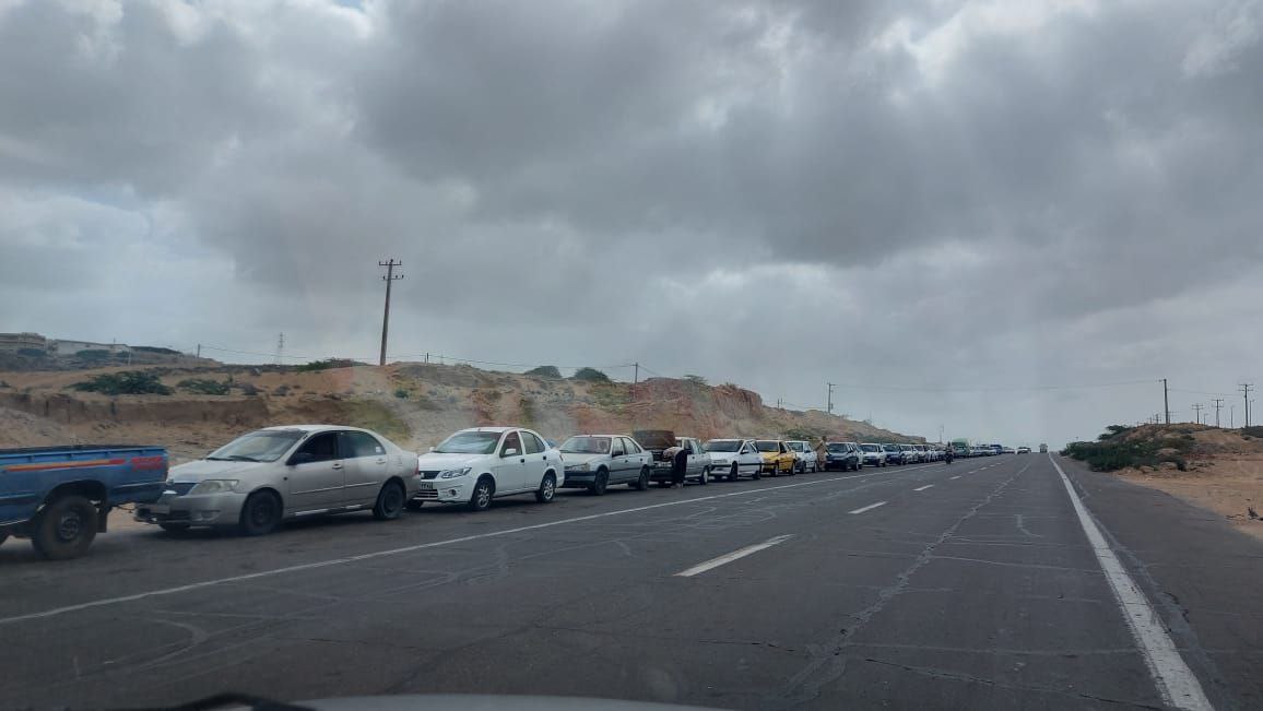 در مسیر برگشت نزدیک چابهار انبوه خودروهای سواری که جلو پمپ بنزین صف کشیدهاند تمامی ندارد.