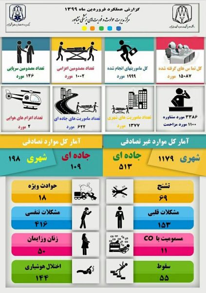 رئیس مرکز مدیریت حوادث و فوریت­ های پزشکی نیشابور گفت: تعداد کل ماموریت­ های این مرکز در فروردین ماه امسال نسبت به مدت مشابه سال گذشته ۱۱ درصد و حوادث ترافیکی ۵۸درصد کاهش داشته است.