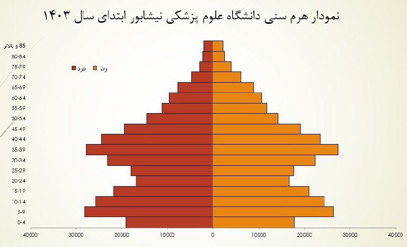 سمیرا هدایت پور کارشناس مسئول آمار معاونت بهداشت نیز اضافه کرد: هرم سنی رسم شده از جمعیت به روز رسانی شده در سال ۱۴۰۳ که گروههای سنی را به طبقات پنج ساله تقسیم می کند، نشان می دهد جامعه تحت پوشش دانشگاه علوم پزشکی نیشابور، یک جامعه دومدی است. بدین معنا که علاوه بر گروه سنی ۳۵تا۳۹ سال که مطابق الگوی کشوری و استانی، بیشترین تعداد جمعیت را با ۹/۹۲ درصد داراست، گروه سنی ۵ تا ۹ سال نیز با ۹/۷۷ درصد از این مدل پیروی کرده و دارای بیشترین تعداد جمعیت است.