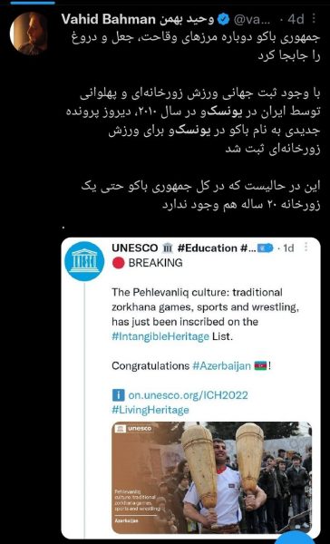 پی نوشت: «فرهنگ پهلوانی: بازیهای سنتی زورخانهای، ورزش و کشتی» در هفدهمین کمیته بینالدولی پاسداری از میراث ناملموس یونسکو که از هفتم تا دوازدهم آذرماه ۱۴۰۱ در شهر رباط مراکش برگزار شده است، به نام جمهوری آذربایجان ثبت شد که در ایران بسیاری از فعالان و کارشناسان میراث فرهنگی نسبت به سکوت و انفعال وزارت میراث فرهنگی، گردشگری و صنایع دستی نسبت به این اقدام جمهوری آذربایجان، واکنش نشان دادند. ایران پیشتر در سال ۲۰۱۰ پرونده «ورزشهای باستانی و زورخانهای» به نام خود در یونسکو ثبت کرده بود.