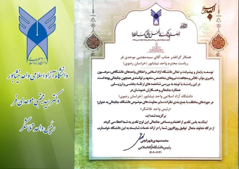 ریاست دانشگاه آزاد اسلامی نیشابور، دکتر سید مجتبی موحدیفر، با رویکردی برنامهمحور و تعاملگرا در قریب به چهار سال گذشته توانسته زمینهساز تحولات مؤثر در حوزههای مختلف دانشگاه شود. بر همین اساس، از سوی مدیران استانی بهعنوان یکی از رؤسای پرتلاش دانشگاهی معرفی شده است.