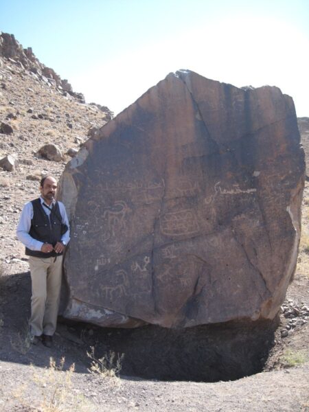 سالم ادامه میدهد: در وسط سنگ داخل کادری مستطیلیشکل، خطوطی وجود داشت که به نظر میرسید حروف خط پهلوی ساسانی باشد. کمی بالاتر، در گوشه چپ تختهسنگ هم نشانههایی به چشم میخورد که بیشباهت به نوشتههای کهن نبود. بیدرنگ دریافتم که این تختهسنگ به ظاهر ساده، در واقع گنجینهای ارزشمند از تاریخ و هنر صخرهای ایران است.