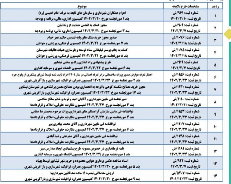 سیزدهمین دستور کار به اسناد مناقصه عکسبرداری هوایی محدوده و حریم شهر نیشابور توسط پهپاد پرداخته شد.