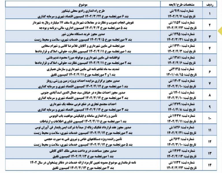 پنجاه‌وششمین‌ جلسه علنی شورای ششم شهر نیشابور با ۱۴ دستور کار در حالی برگزار شد که ابهام در برگزاری مناقصات شهرداری سوال‌ برانگیز شد و در ادامه معلوم شد زمینی که شهرداری برای انتقال میدان بار مشخص کرده سند ندارد!