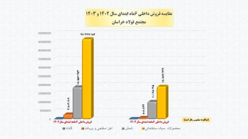 در ششماهه نخست ۱۴۰۳، میزان فروش داخلی محصولات فولاد خراسان با کاهش همراه بوده و درآمد آن به ۲۹,۷۹۴,۷۹۶ میلیون ریال رسیده است که برای روشن شدن ماهیت اصلی آن نیازمند تحقیق و بررسی بیشتر می باشد. این مقدار نسبت به درآمد ۶۷,۸۰۷,۰۴۴ میلیون ریالی دوره مشابه سال گذشته، کاهش یافته است. همچنین، درآمد فروش صادراتی نیز به ۵۱۸,۲۱۹ میلیون ریال رسید که نشاندهنده کاهش نسبی نسبت به سال گذشته است، هرچند که همچنان تحت تاثیر چالشهای نرخ ارز و کاهش تقاضای بینالمللی قرار دارد.