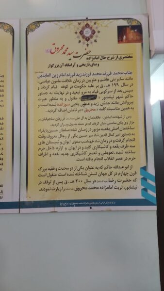 حجتالاسلام و المسلمین محمد احمدزاده در این نشست با شماره به اینکه از تعداد ۲۵۰ بقعه متبرکه امامزادگان در استان خراسان رضوی یک پنجم این بقاع متبرکه در نیشابور است اظهار کرد: در نیشابور امامزادگان شاخص و بقاع متبرکه ویژه وجود دارد که باید به همه آنان پرداخته شود اما آستان مقدس امامزاده محروق شخصیت ممتازی در بین امامزادگان استان و کشور است و در اینمیان تنها شخصیتی است که یک امام معصوم به زیارت آن آمده است.
