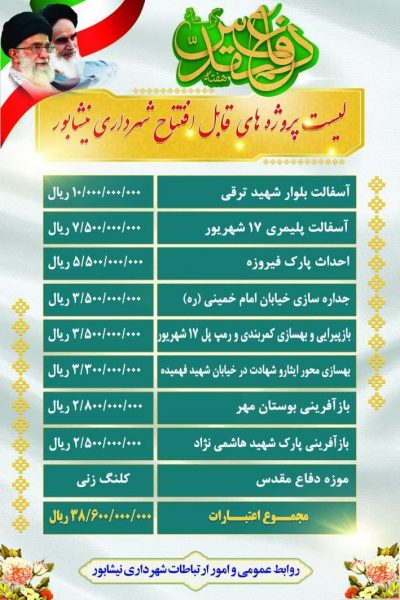 شهردار نیشابور یکشنبه در آیین افتتاح این طرح ها با گرامی داشت یاد و خاطره ۸ سال دفاع مقدس گفت: بنا به گفته های رهبر انقلاب در خصوص اهمیت سال پایانی خدمت دولت و اهمیت این ۳۶۵ روز، این موضوع را سرلوحه کار خود قرار دادیم و با مدیران شهرداری تصمیم گرفته ایم در هر صد روز ۱۰ پروژه شهرداری را به بهره برداری برسانیم.